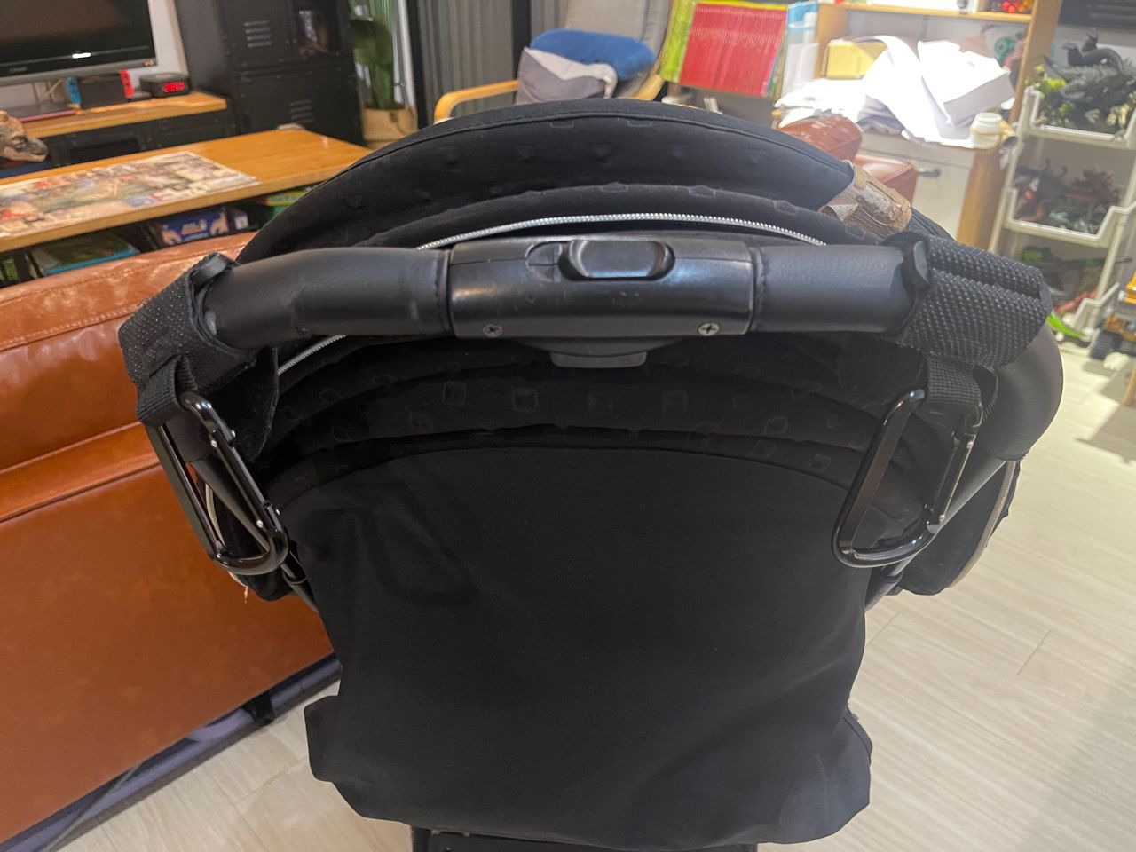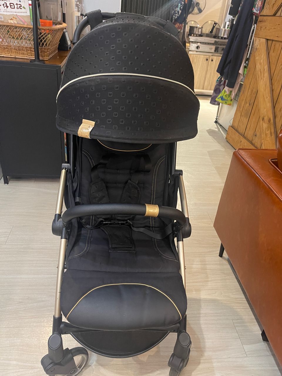 推車附 自行加購的握把雙掛勾、遮陽頂,實用性高。