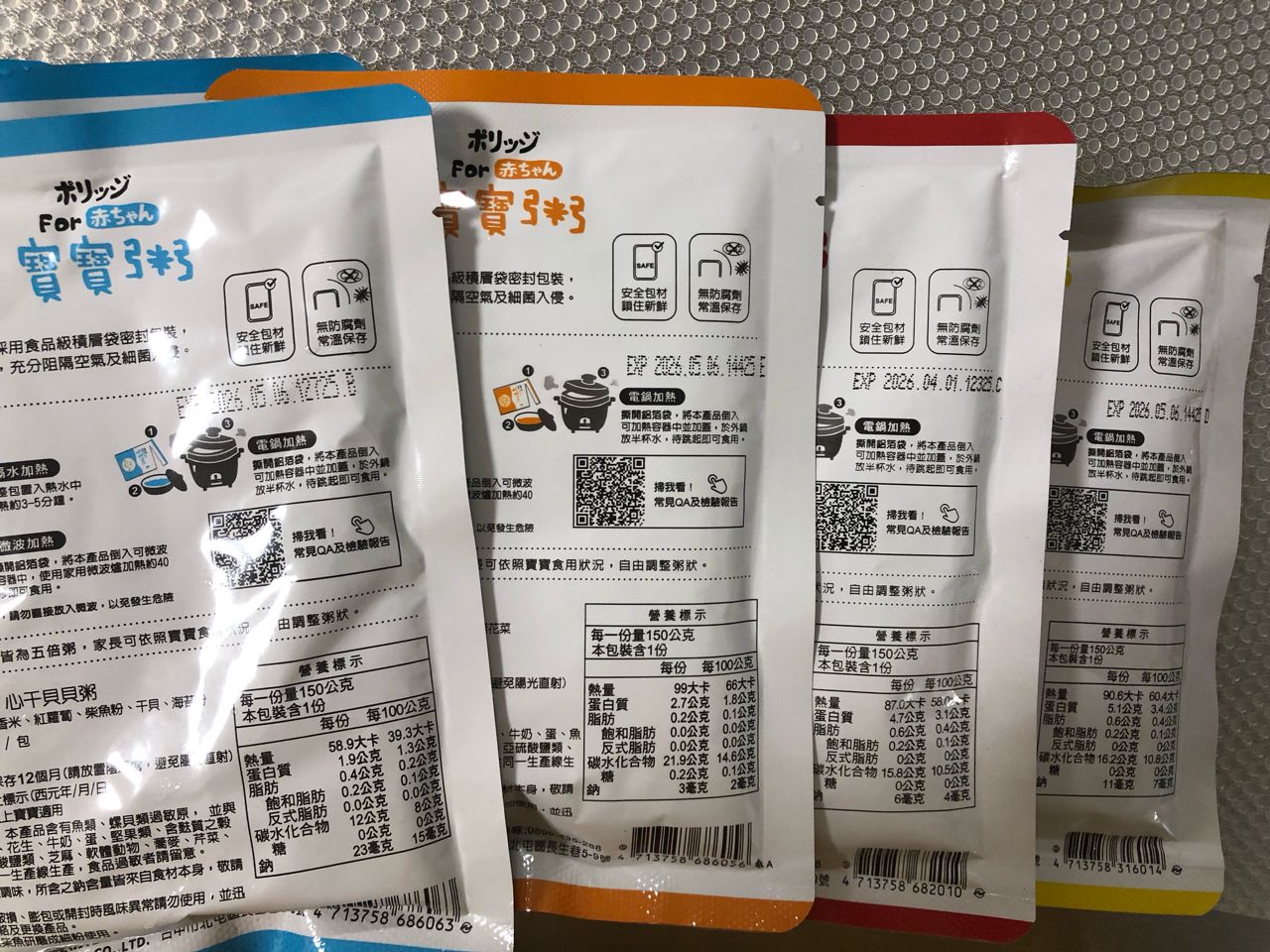 內容物名稱:心干貝貝粥3包、飽飽南瓜粥1包、乖乖豬豬粥1包、原淬寶寶雞肉粥1包