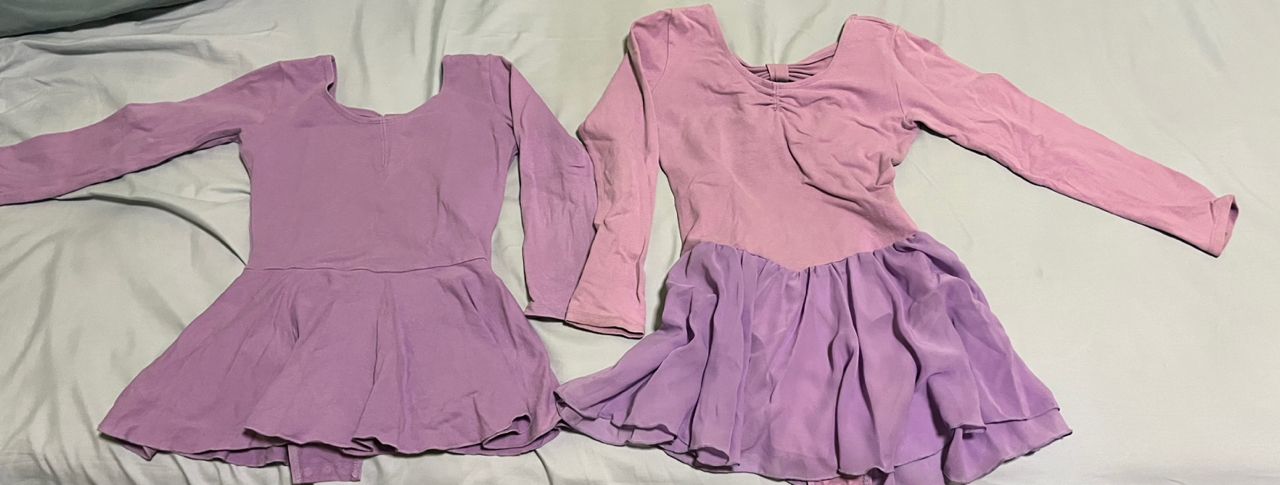 如題,淺紫(有紗裙/身高140)及深紫(無紗裙/身高130),衣況良好。附上二手舞鞋一